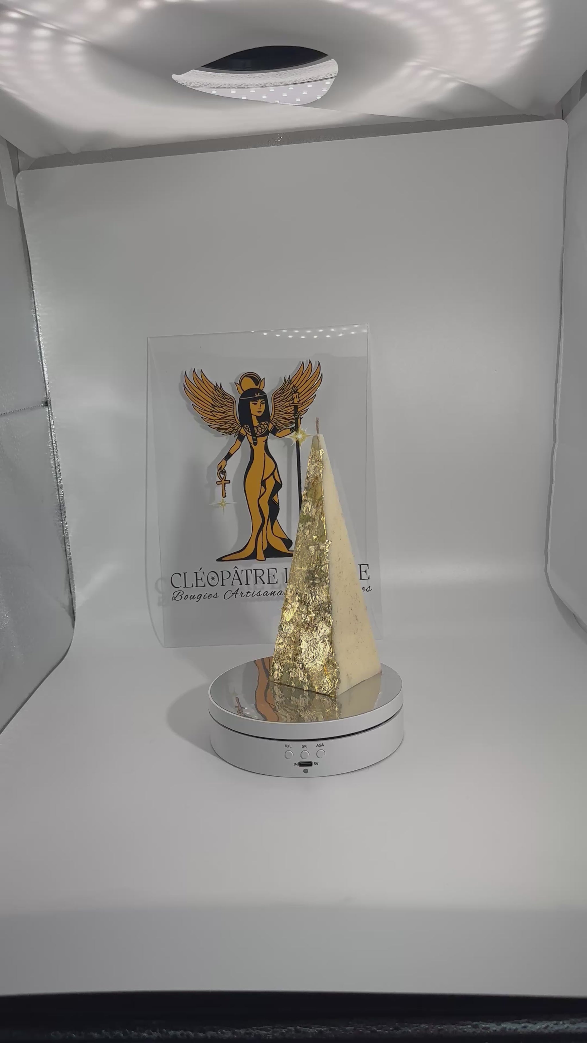 Sculptée à la main dans notre atelier parisien, cette bougie pyramidale associe géométrie moderne et raffinement intemporel. L’application minutieuse de feuille d’or sur une moitié de la bougie crée un contraste harmonieux entre mat et éclat, pureté et opulence.